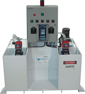 LabDELTA™ from Wastech Controls solves laboratory waste treatment problems with small-volume, automated systems. These are ideal as school laboratory waste treatment systems. Complete packages are available in either 2, 4 or 6 gallon batch designs or 1, 2 or 3 gpm continuous designs with complete controls, including communication options for alarm reporting. Acid waste neutralization (AWN) including strong acid neutralization (0-2 pH) is typical. Other systems handle heavy metals, fluoride reduction, and pH adjustment for caustic fluids, automatically and without risk to lab personnel. Accidents from exothermic reactions, spills, burns and glass breakage are eliminated. Using various system designs including two-stage neutralization, limestone pretreatment, or packaged chillers with PVDF or Telfon heat exchangers, Wastech Controls treats the waste safely and prepares it for dumping into the sewer. The units are small and compact, fabricated of polypropylene, with drip pans or double-containment as requested, and include all sensors and controllers. |